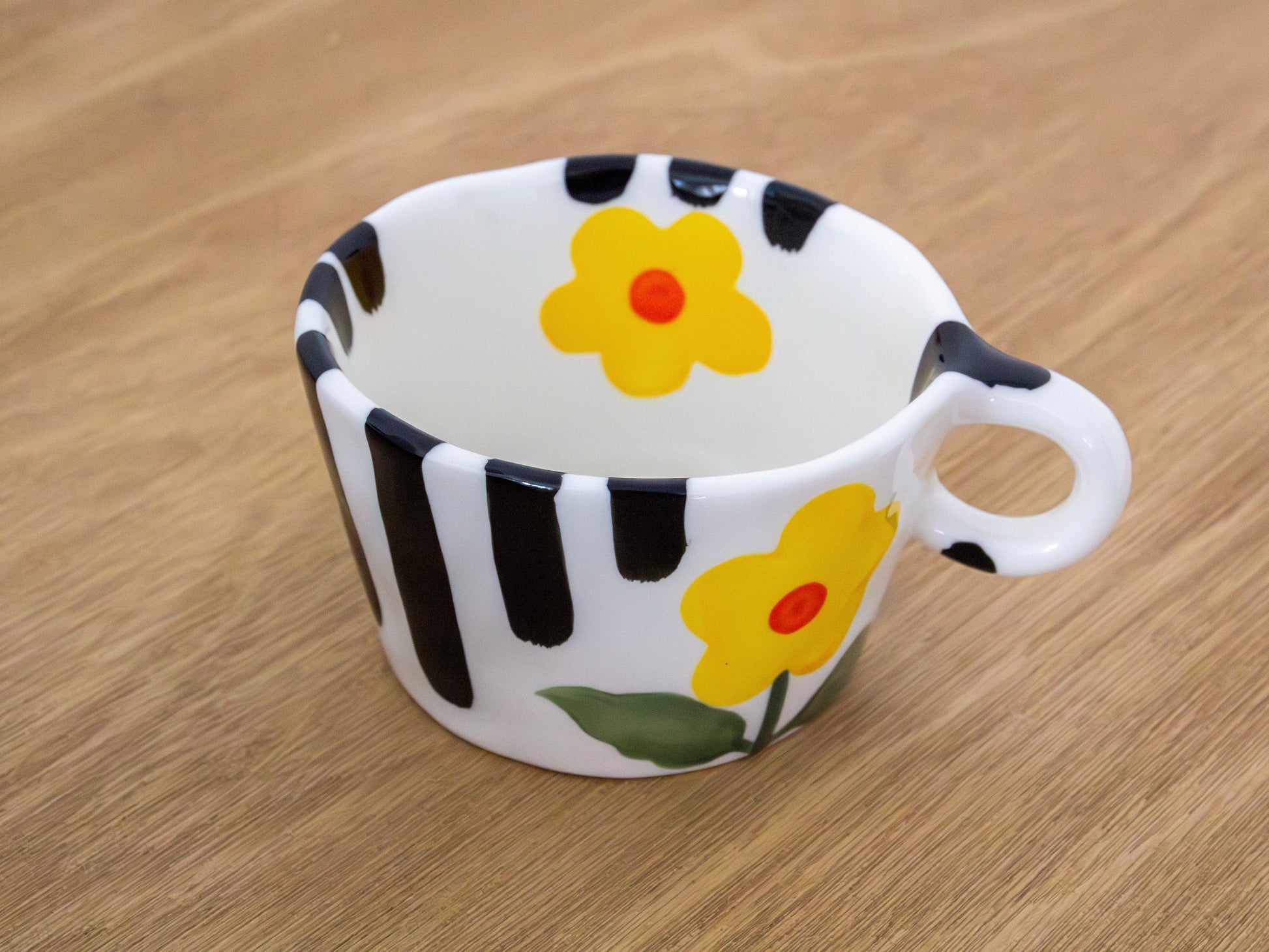 nuetro tazón hibisco combina flores amarillas con rayas negras, creando un diseño único. perfecto para darle un toque colorido a tus bebidas favoritas
